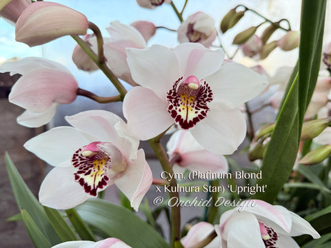 Cym. (Platinum Blond x Kulnura Star) ‘Upright' – A very nice Cymbidium with a dozen or more 3.5" – 4" light pink and white flowers, nice shape with red spots on lip. Those spikes are tall above the foliage. Some are multiple spikes. Easy to bloom and a good start for Cymbidium lovers!